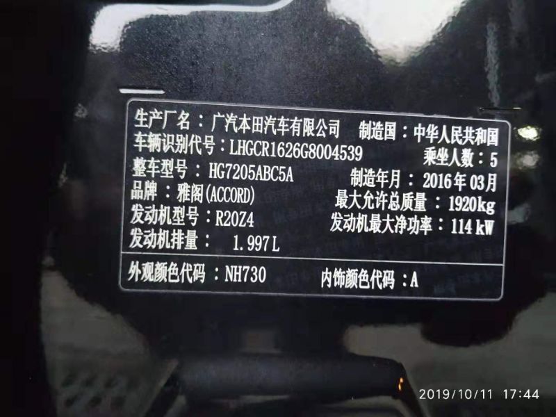 海豐2016年本田雅閣14.X萬元. 自動2.0L